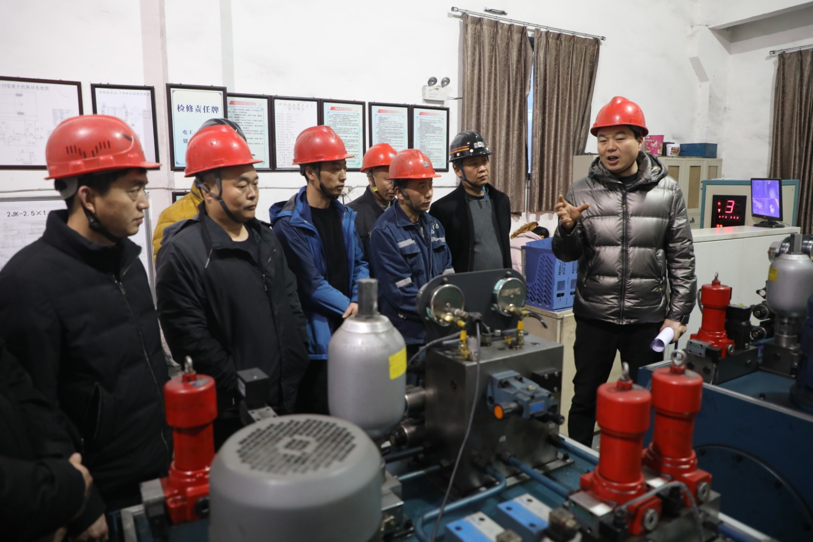 夏若介针对提升运输薄弱环节,拓展“实操+理论+互动”的培训新平台,将实操课堂设于主井提升机房,详细讲解了主提升机盘型闸的结构组成与原理,分享了实用的故障判断及处理方法,结合本矿实际案例进行故障排除分析,与学员们共同探讨并优化故障处理方法。