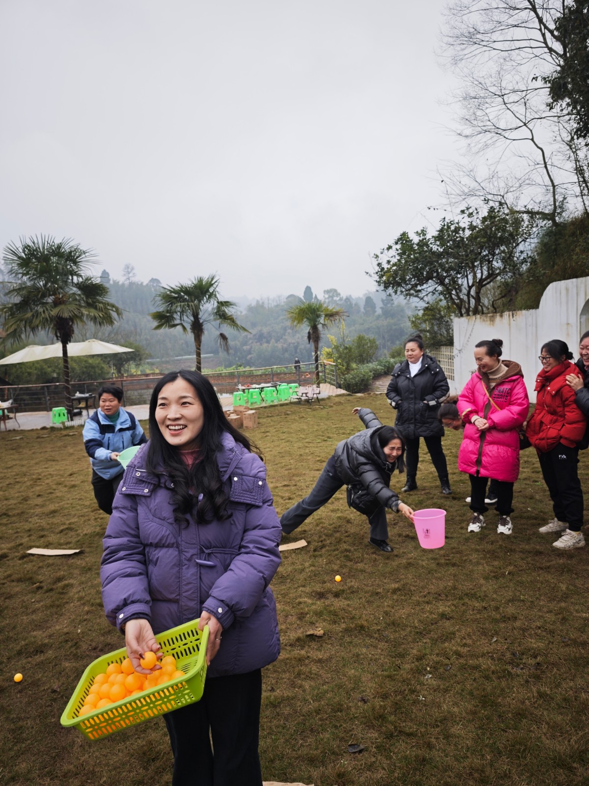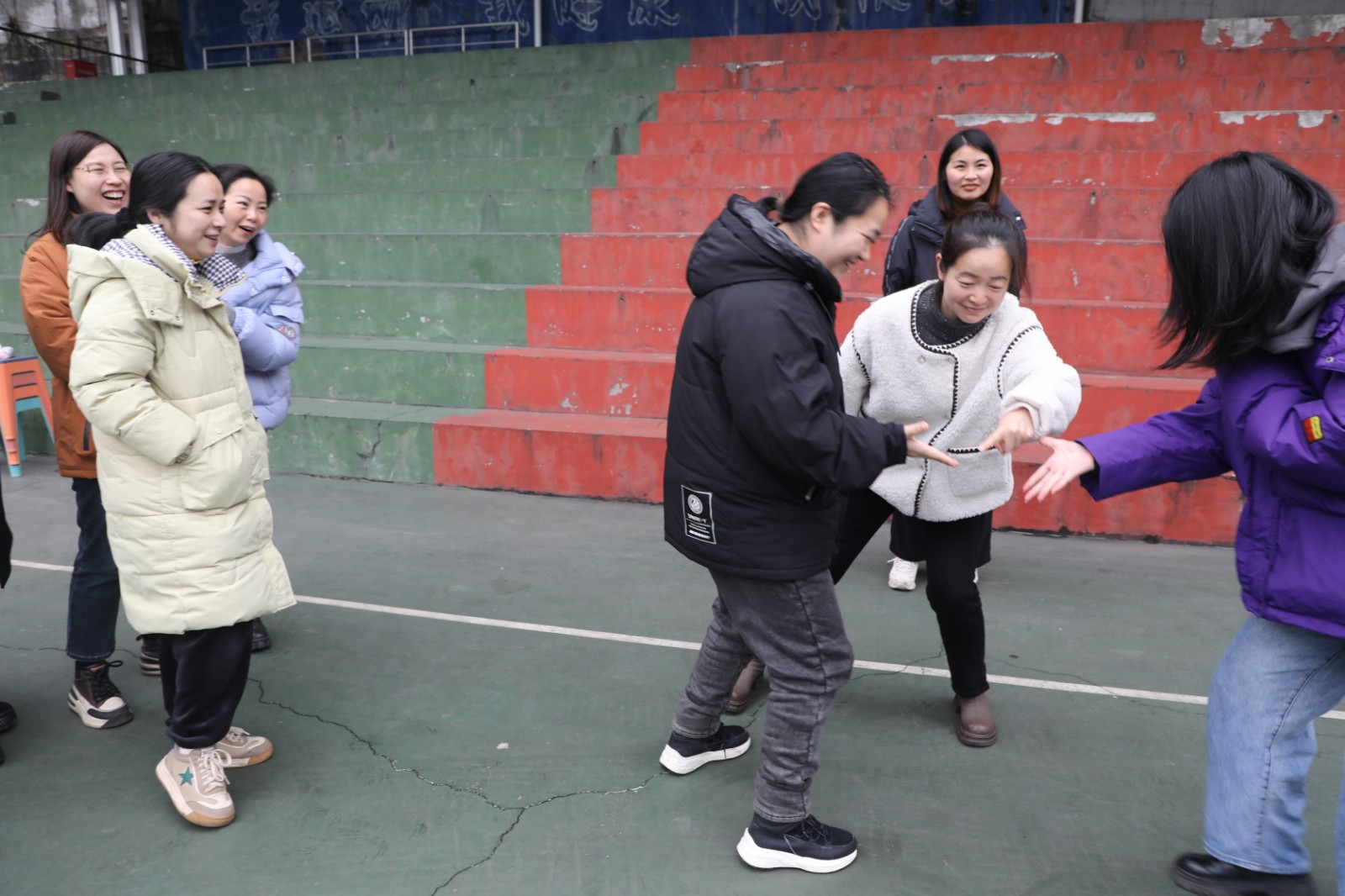 公司机关和营销公司近40名女工在官斗山篮球场开展趣味活动,指令抢夺将参与者分为两队,两队相对而立,中间放礼物,按照主持人口令做动作,双方先抢到礼物者为胜。对参与者反应能力是一种考验,很多人不是动作做错了就是慢半拍,引人捧腹大笑。猜拳过河比拼的是运气,有的人一直输,眼睁睁地看着赢家越跑越远,让人忍俊不禁。团结一条龙的参与者每人手持一瓶矿泉水抛向右边的队员,同时接住左边队员抛来的水瓶,然后向后跑,每名队员重复动作直至完成全员接力,速度最快用时最少的队伍获胜。队员们默契配合,左右开弓,遍地乱滚的矿泉水瓶让人手忙脚乱笑料百出。你比我猜中幽默的语言,夸张的肢体动作更是将氛围推向了高潮,笑声、欢呼声久久回荡。