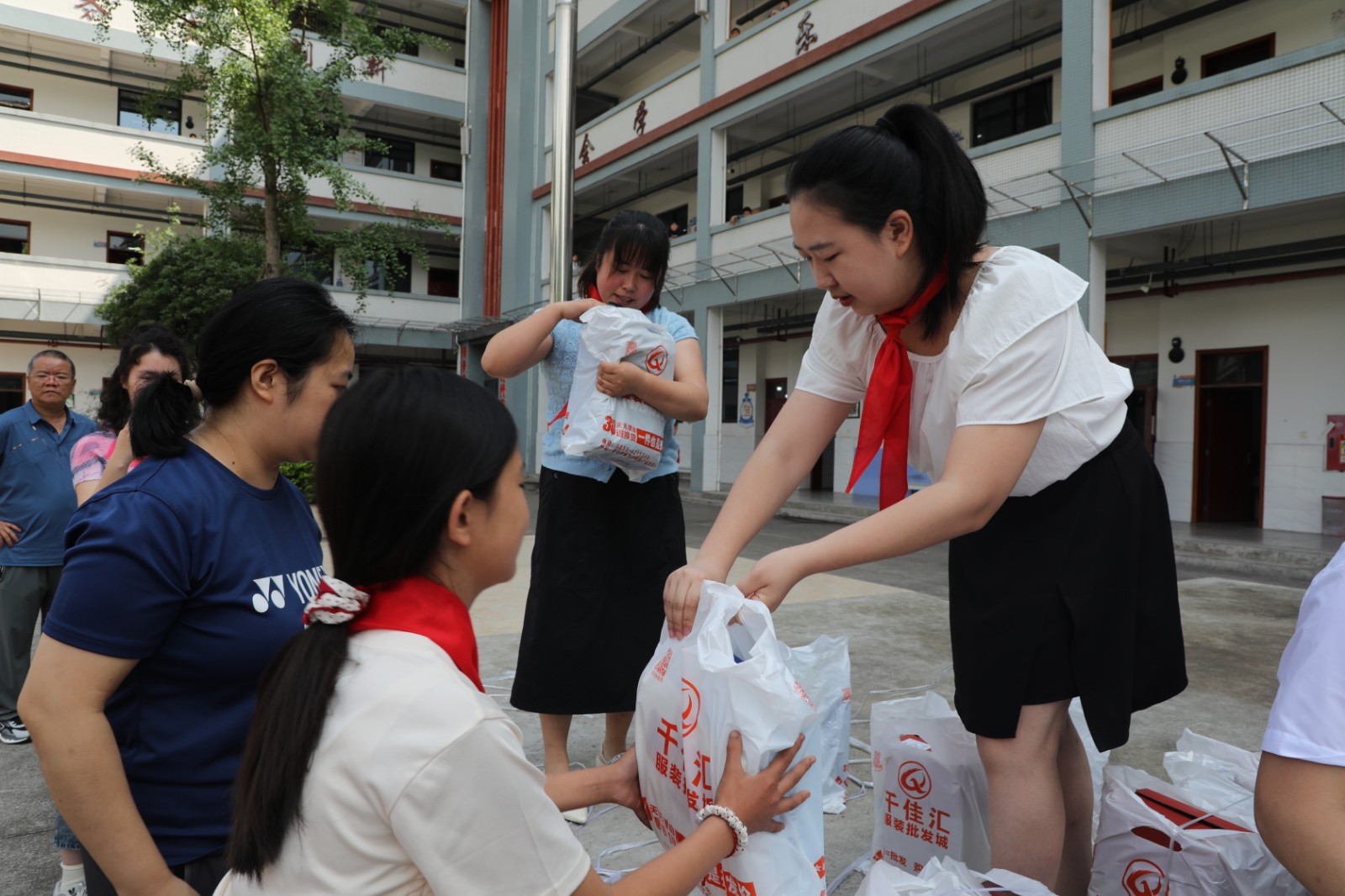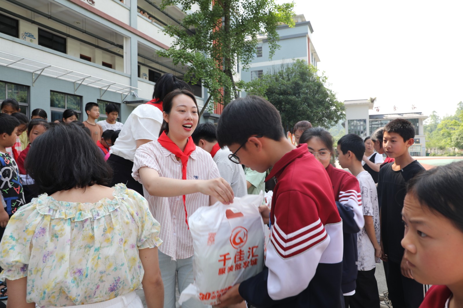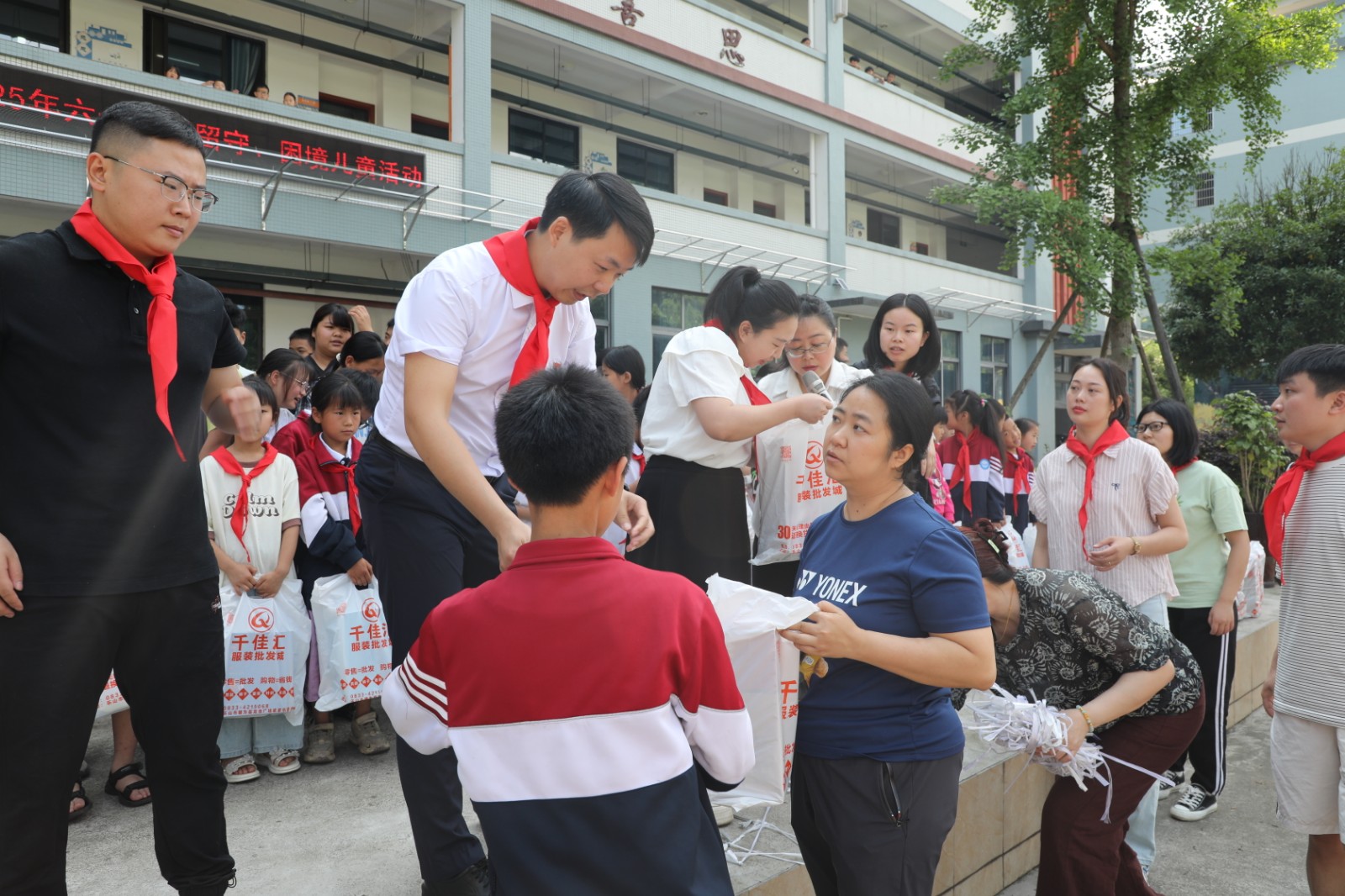 在学校操场上,公司为学生们送上了精心准备的衣服和鞋子。学生们手捧这份温暖的“六一”礼物,脸上绽放出幸福的笑容,充满了童真与欢乐,整个活动现场洋溢着温馨和谐的氛围。