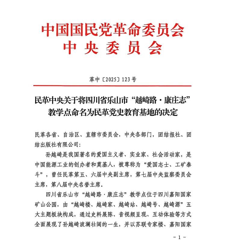 近日,民革中央正式印发决定,由四川嘉阳集团与乐山市委统战部,民革乐山市委员会、犍为县委统战部等联合打造的乐山市“越崎路·康庄志”教学点命名为民革党史教育基地,将成为民革凝心铸魂的精神家园、固本强基的生动课堂,为巩固拓展主题教育成果、夯实多党合作共同思想政治基础提供有力支撑。