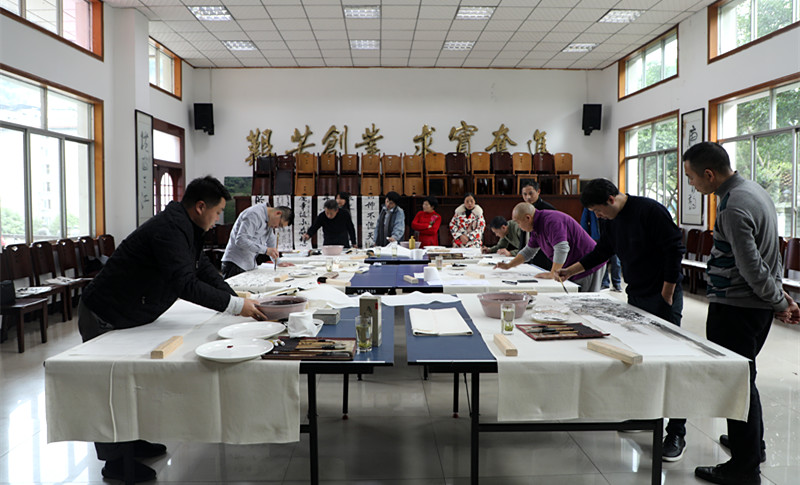11月21日下午,书画家们在办公楼一楼会议室进行现场创作,吸引了部分矿区书画爱好者在场观摩交流。书画家们在三尺素纸上或挥毫献字,或泼墨作画。著名画家王发强先生在4个小时中凝神专注,不停勾勒、着色,将小火车田原风光、芭蕉沟秋色景致以水墨呈现于画纸,把“艰苦创业、求实奋进”等嘉阳精神述之笔端……画家钟士敏在作画的同时还高兴地与嘉阳的书画爱好者交流,感叹小火车沿线的美丽景致和人文都是极好的创作素材,希望有机会能再来写生创作,并鼓励爱好者要善于去发现身边的美好,更好地去理解,把这里的生活、景致更好地融入作品,使作品更接地气。7位书画家们现场共创作出近30幅书画作品,他们把对嘉阳美好的祝愿通过作品的形式留存于嘉阳。