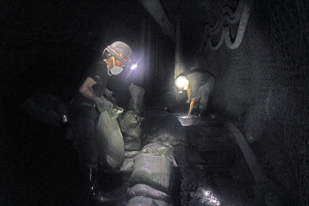 走进巷道,来到机头前方安装了液压支柱的工作点,两名穿了齐膝深雨靴的职工正在忙碌着,一个站在水沟里清淘煤泥,一个在将从水沟中挖出的煤泥装入砂袋中,然后将砂袋码放到水沟边上作为堡坎,白色的口罩和手套已经变成了黑色,身上的工作服上也沾满了泥浆。胡同富是嘉阳煤矿采二队采二组的大组长,4月份以来,采二组一直在这个工作面上早班,他说:“我们每天都要安排专人对风巷和机道内的煤泥进行清理,对两边的水沟和几个挖好的涵凼进行清淘,工作量和劳动强度都非常大。”