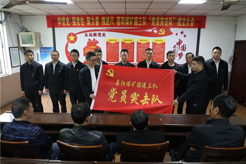 掘进三队党支部书记秦刚在接过“党员突击队”旗帜时表示:全队上下务必坚定信心,昂扬斗志,发扬嘉阳人“特别能吃苦、特别能战斗”的优良作风,坚定信心,战胜困难,坚决打赢这场“进尺攻坚战”。党群部部长姚建军希望掘三队的党员同志们要以党史学习教育为契机,提高思想认识,强化责任担当,大力弘扬煤矿“燃烧精神”,在急难险重任务中彰显党员的先锋模范作用,积极营造“比、学、赶、超”的浓厚氛围,以榜样的力量带动全队职工奋勇争先,以党建引领促进安全生产任务的圆满完成。
