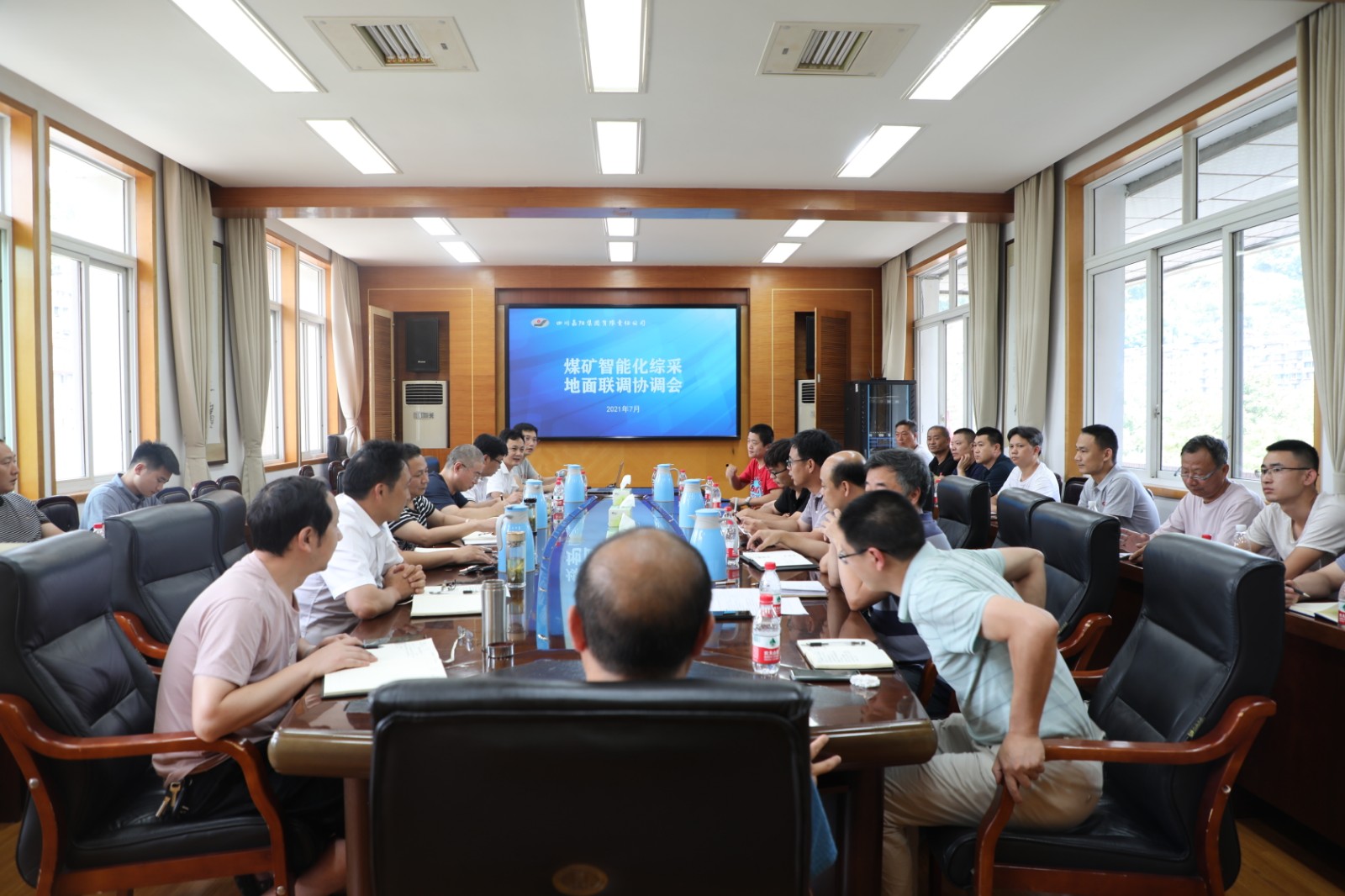 7月27日,嘉阳集团召开智能化综采地面联调协调会,总经理、智能化综采项目领导小组组长范勤英,副总经理、副组长王维洪、詹本远,总经理助理丰雄龙,嘉阳煤矿矿长陈文兵,公司机电主任工程师、智能办主任刘爱明等出席协调会,智能化综采安装工作相关责任人、厂家技术人员、物供司相关人员以及公司智能化综采项目技术服务团队相关人员参加会议。