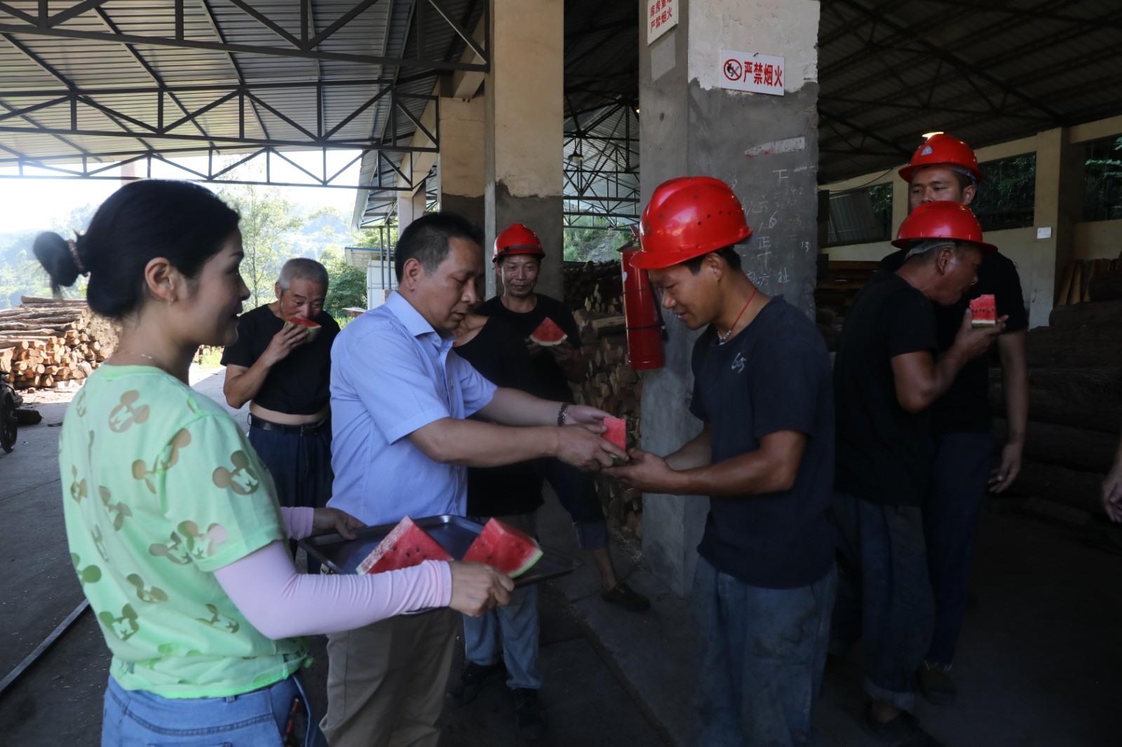 在物资供销公司仓储部、木材库、炸药库,副总经理王维洪、总经理助理丰雄龙等二支部分会人员向作业人员送去了西瓜、矿泉水等清凉消暑物品,叮嘱他们在工作的同时做好防暑降温。分会还检查了物资供销公司防暑降温工作措施,防暑药品发放情况。副总经理王维洪对他们说:“班组在布置工作时要灵活安排,尽可能避开高温时段在室外作业;无法避免时,要准备好防暑药品,落实好防暑措施,防止高温中暑。”