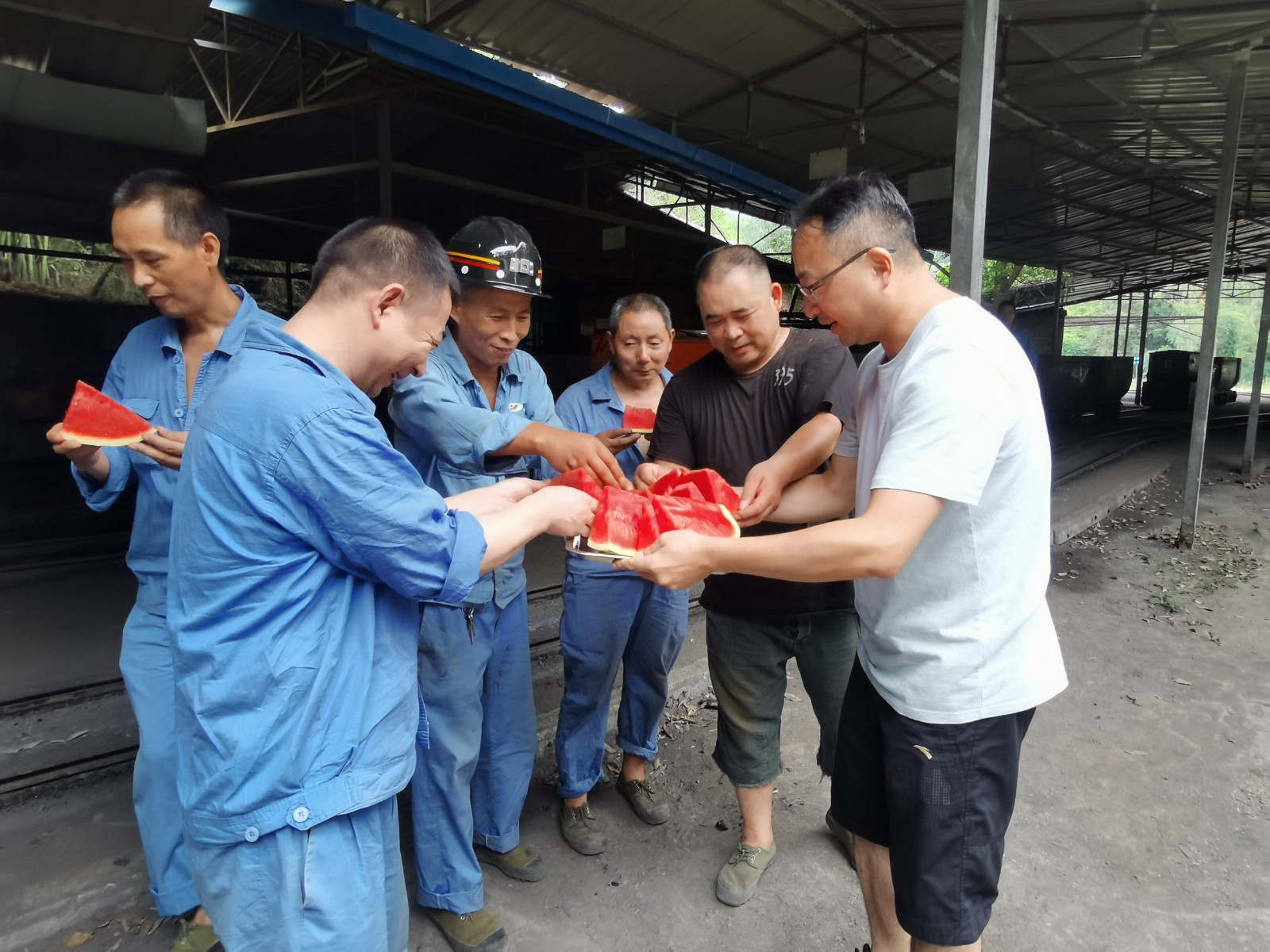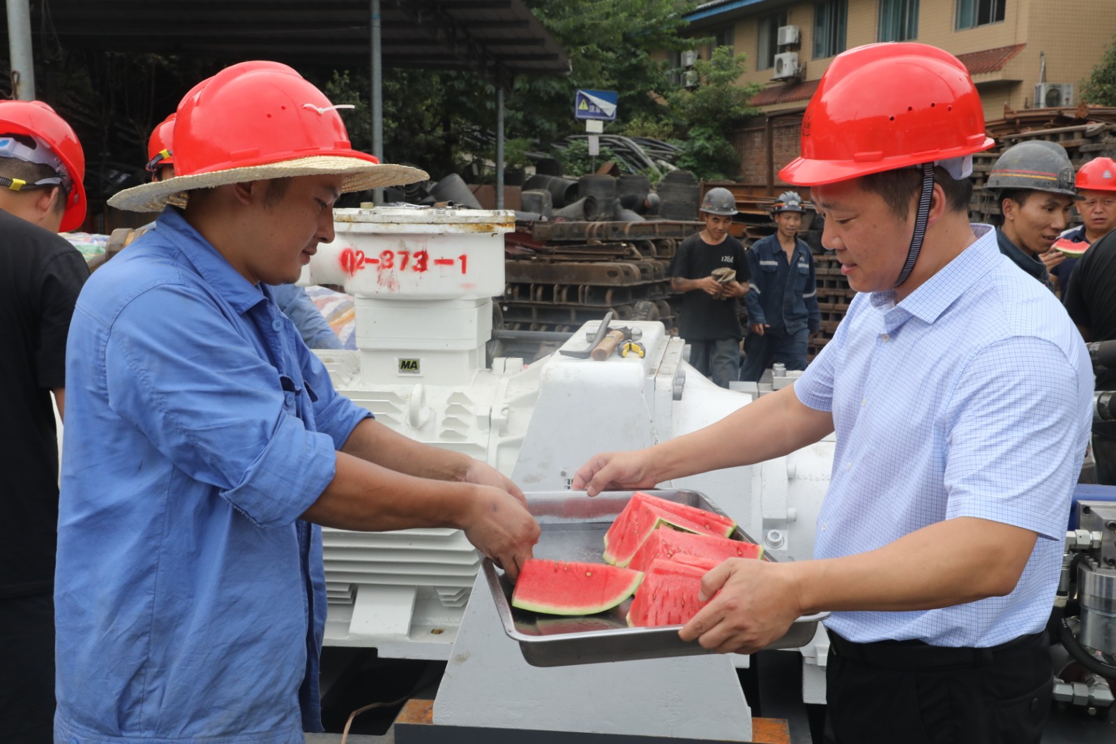 持续高温天气,酷热难当,天锡井工业广场却是一派热火朝天的繁忙景象。为了智能化综采全系统联合试运转工作如期圆满完成,尽管天气炎热,工人师傅们个个挥汗如雨,但仍然全力奋战在工地上……7月30日,集团公司总经理范勤英带领机关三支部的党员看望慰问作业人员,送上清凉的西瓜、矿泉水,表达组织的关心和问候,并一再盯嘱相关负责同志:天气炎热、安装工作紧张,更要切实做好职工的防暑降温工作,合理安排好露天作业时间,确保地面一线作业人员的身体健康和安全。