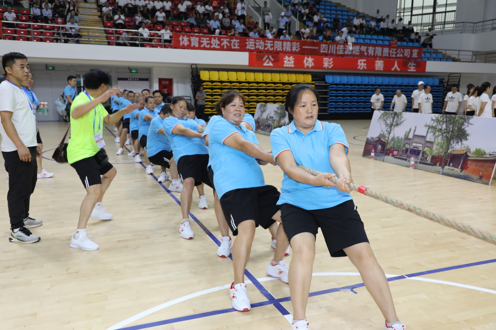9月23日下午,拔河比赛开赛。嘉阳集团代表队首轮迎战实力强劲的城投集团代表队。第一局比赛,城投集团首先掌握场上节奏,立足未稳的嘉阳集团代表队被拉了一个措手不及很快输掉了第一局。趁着场上休息两分钟的时间,嘉阳代表队进行了快速调整进入到第二局。当哨音一吹响,嘉阳代表队凭借调整好的状态迅速掌握了场上节奏,顺利赢得了第二局。第三局比赛开始,双方都很快进入状态,场上高强度的相持时间达到45秒,最终嘉阳代表队凭借更好的持久力赢得了关键局的比赛。第二轮,嘉阳代表队对战乐山职院代表队,由于在上一轮比赛中消耗了大量体力,嘉阳代表队被乐山职院代表队直胜两局。