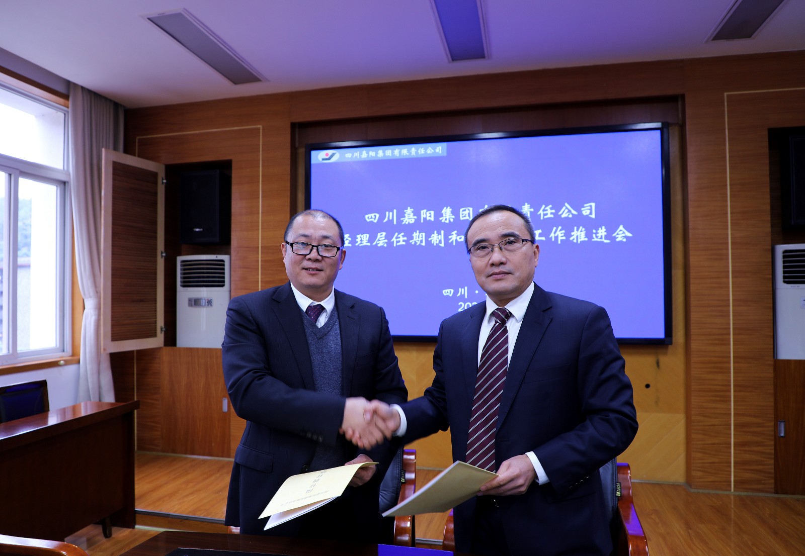 经理层成员任期制和契约化管理是省国资委、川投集团对国企改革三年行动重要的工作任务和要求,是坚持和加强党对国有企业的全面领导,保持国有资产保值增值,发挥党管干部和市场化机制作用相结合,打造企业与职工命运共同体,助推企业高质量发展的需要。会上,人力资源和社会保障部部长秦云中代表嘉阳集团三项制度改革专项行动工作小组办公室汇报了企业三项制度改革专项行动的基本情况。由嘉阳集团公司董事会授权,嘉阳集团法定代表人、党委书记、董事长杜勤代表董事会与嘉阳集团经理层干部分别签订了《嘉阳集团公司2020—2022年度岗位聘任协议》《嘉阳集团公司2021年度目标责任书》《嘉阳集团公司2020—2022年度任期目标责任书》。由宜宾福溪粉煤灰公司董事会授权,其法定代表人、党支部书记、董事长代学平代表福溪粉煤灰公司董事会与经理层人员签订了聘任协议和两个目标责任书。