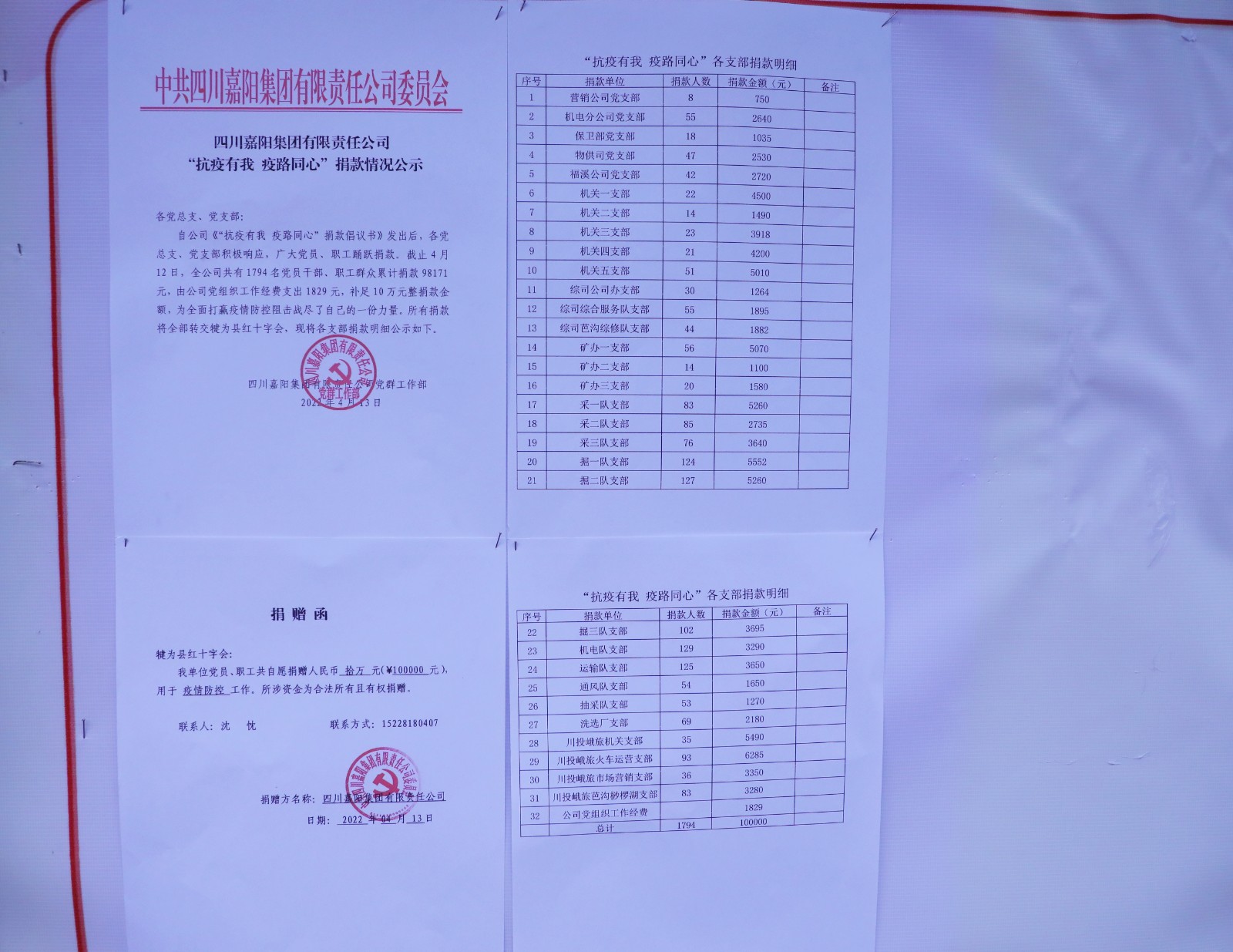 疫情爆发后,嘉阳集团一边做好自身的疫情管控,一边发动党员、志愿者积极支援县城防疫。公司党委、工会在第一时间发出了“抗疫有我 疫路同心”捐款倡议,全体党员和职工积极响应,发扬“一方有难、八方支援”的精神,通过微信支付、当面上交党支部等不同方式踊跃捐款,助力疫情防控。点滴爱心汇聚汪洋,无私捐助凝聚真情,短短几天时间内,就收到1794人捐款98171元。