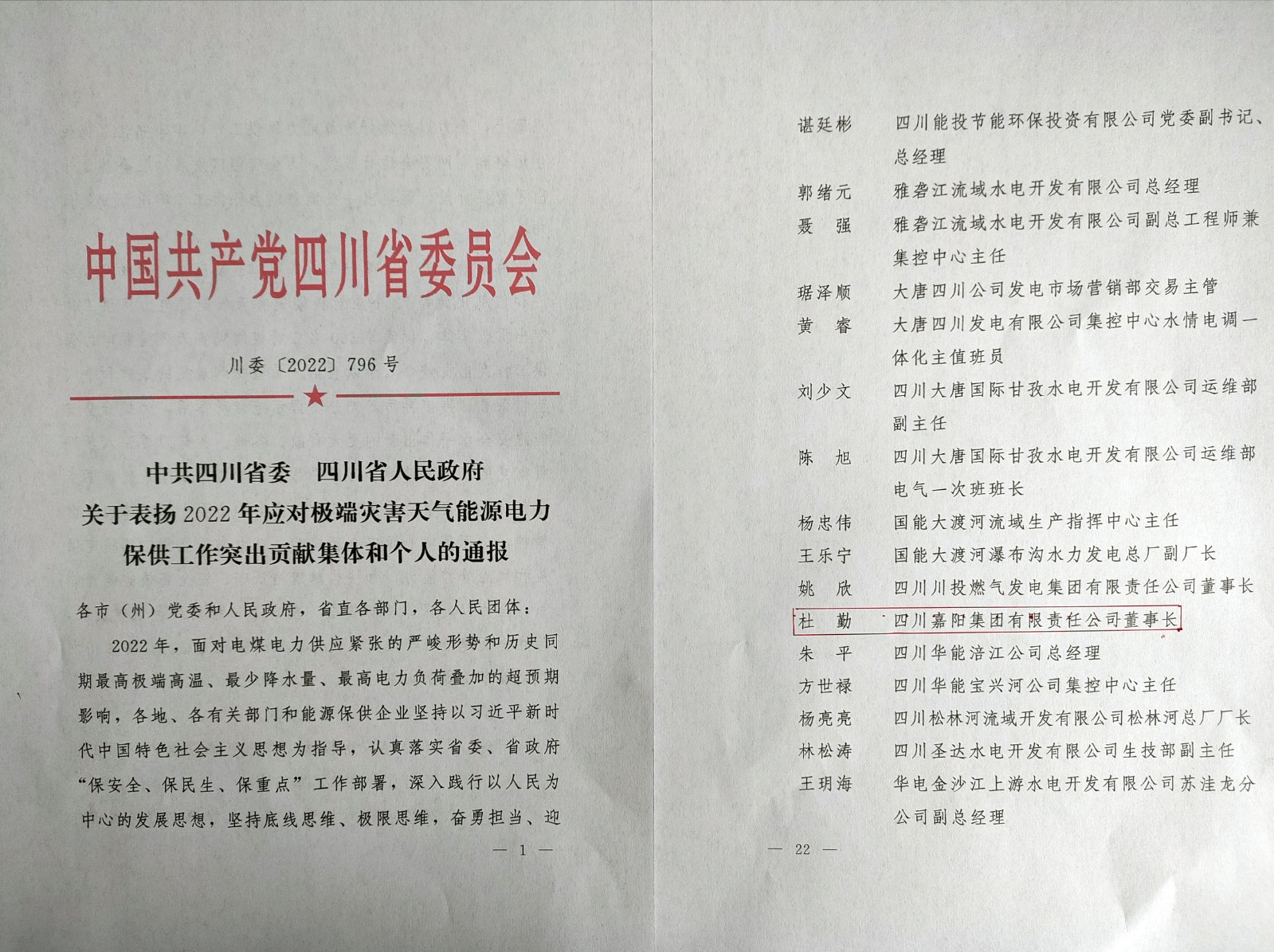 近日,中共四川省委 四川省人民政府对2022年应对极端灾害天气能源电力保供工作突出贡献集体和个人进行通报表扬,嘉阳集团党委书记、董事长杜勤榜上有名,再获殊荣。